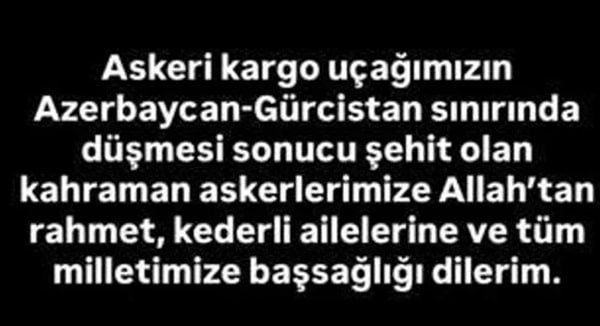 Askeri kargo uçağımızın Azerbaycan-Gürcistan sınırında düşmesi sonucu şehit olan kahraman askerlerimize Allah’tan rahmet, kederli ailelerine ve tüm milletimize başsağlığı dilerim.