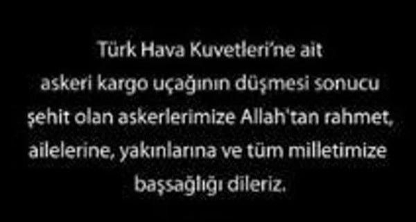 Türk Hava Kuvvetleri'ne ait askeri kargo uçağının düşmesi sonucu şehit olan askerlerimize Allah'tan rahmet, ailelerine, yakınlarına ve tüm milletimize başsağlığı dileriz.