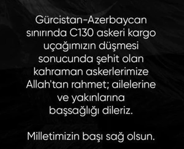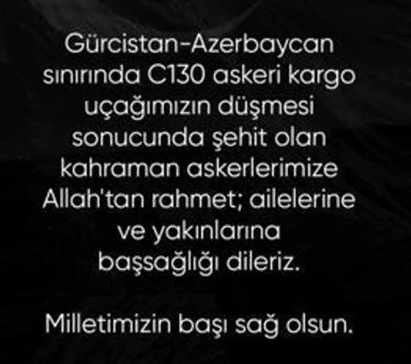 Gürcistan-Azerbaycan sınırında C130 askeri kargo uçağımızın düşmesi sonucu şehit olan kahraman askerlerimize Allah'tan rahmet; ailelerine ve yakınlarına başsağlığı dileriz.