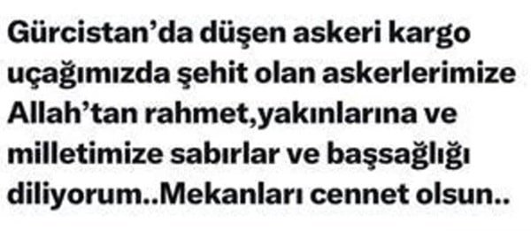 Gürcistan’da düşen askeri kargo uçağımızda şehit olan askerlerimize Allah’tan rahmet, yakınlarına ve milletimize sabırlar ve başsağlığı diliyorum. Mekanları cennet olsun.